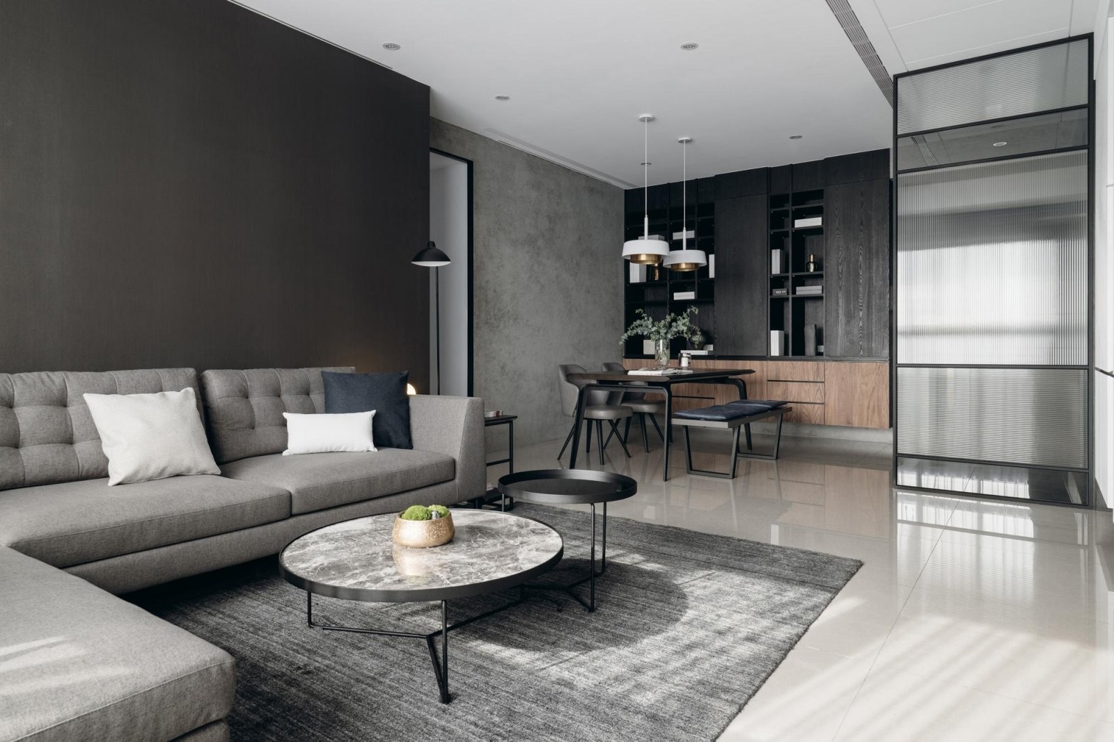 在整个房屋内,墙壁是按照温暖的白色、浅灰和黑色调来确定的,木材面板覆盖着客厅的隔墙。