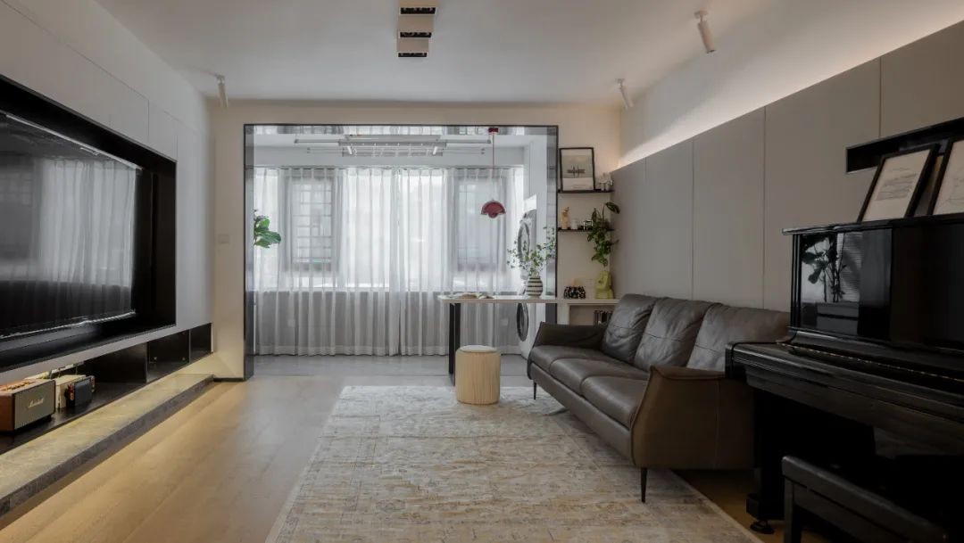 坐北朝南的大客厅,地面选用了从玄关开始始终沿用的原木色木地板,配上同色系地毯,温暖显大。