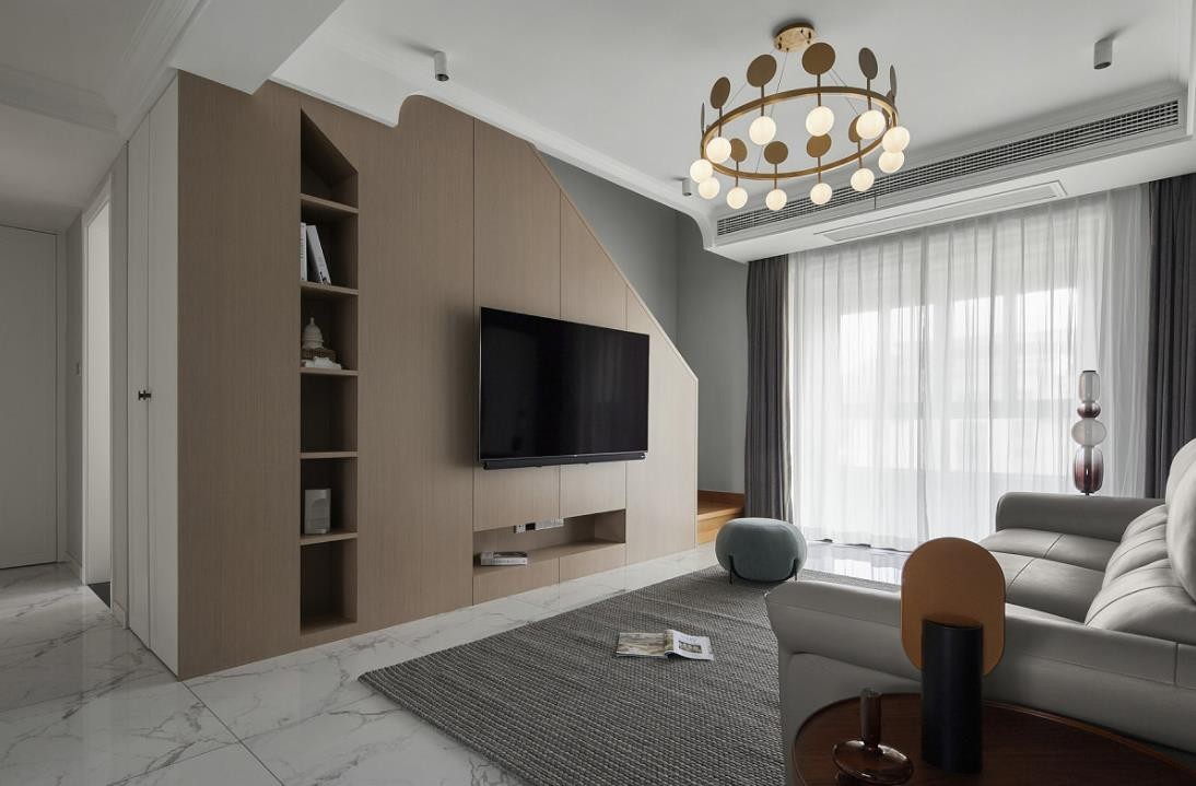 电视背景墙采用部分开放式展示柜,摆放主人公喜爱的艺术摆件,增添空间趣味性,木饰面装饰,温润有力。