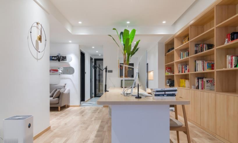 整体白色与木色的搭配,带来一种简约舒适而从容的空间氛围。书柜上方顶面还藏了一圈灯带,增加灯光氛围的层次感。