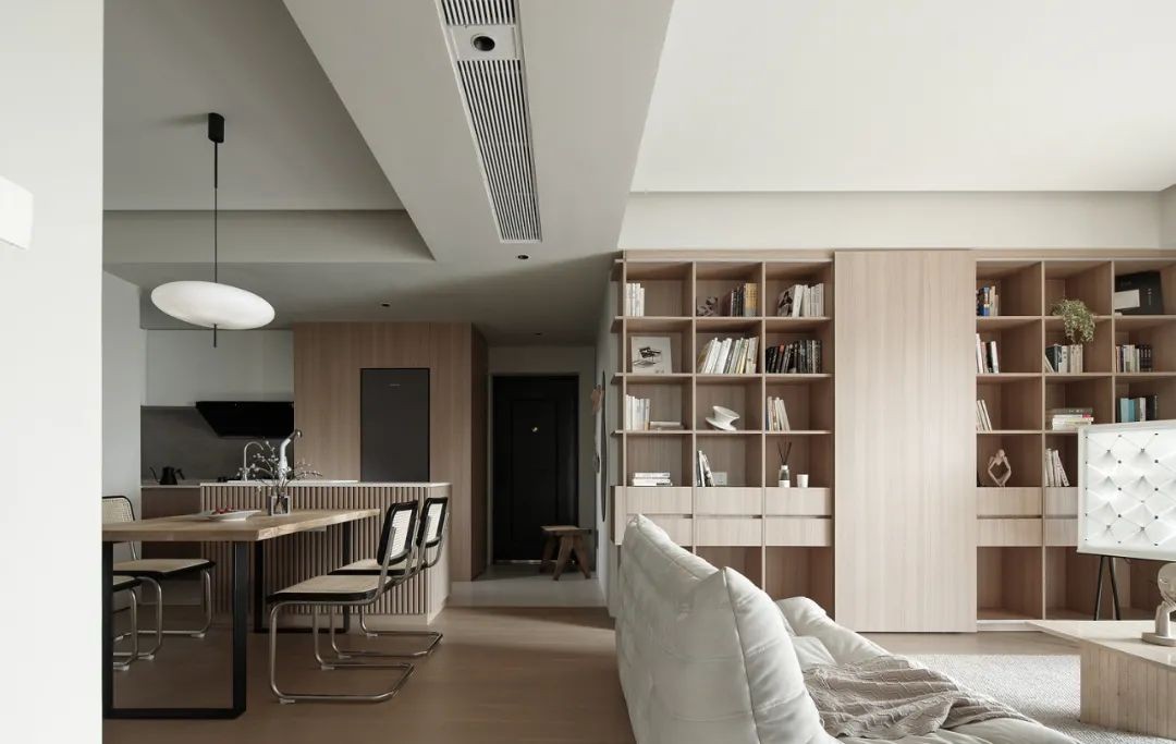 根据屋主的需求,在客厅设置了整面的开放格书柜,既有收纳又有展示的空间,根据喜好放置书籍、艺术摆件等,随时保持家的新鲜感,利用落地画框电视,灵活移动且不占空