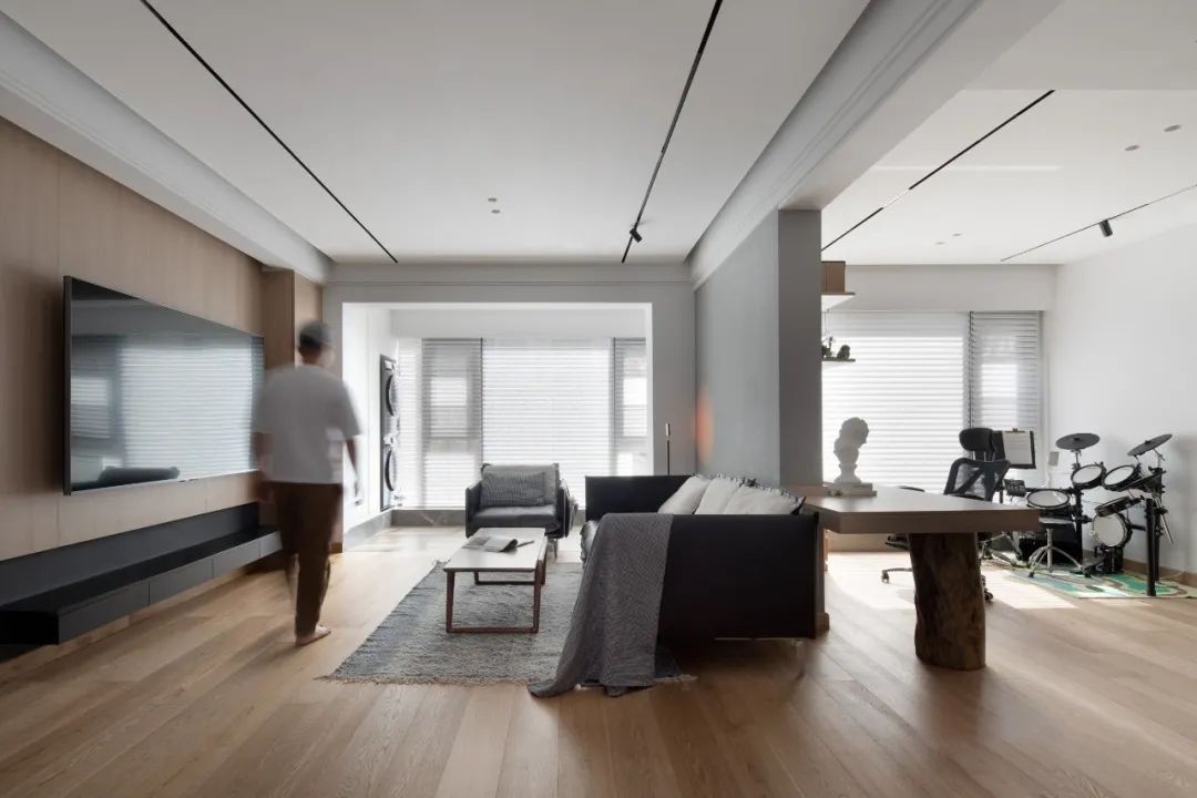 空间打开后,公共空间的采光与通透性都得到了大大提高。宽敞的落地窗撒下充足的阳光,搭配百叶帘,室内空间更显柔和安逸