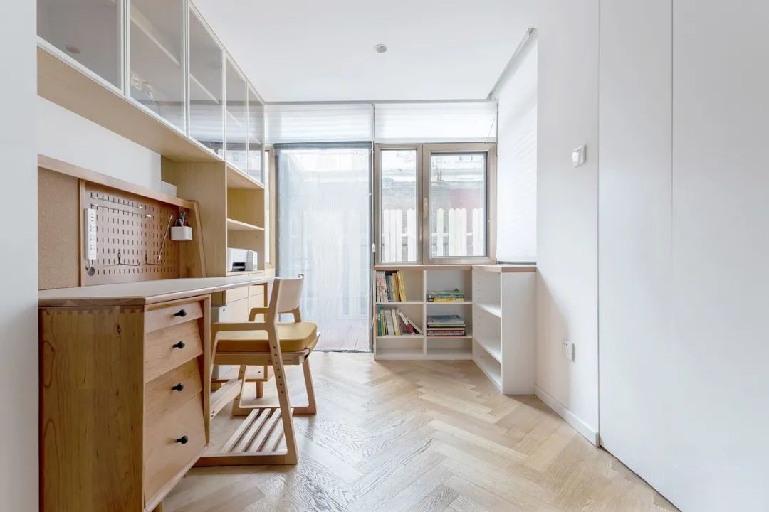 本案是一套学区房,主要是为了孩子上学而购置的, 所以房子的整体设计,主要是围绕孩子,屋主的诉求主要有2点,收纳以及变更两居。户型改造:厨房呈现开放式布局,入户显得宽阔一些;卫生间洗漱区外移到过道,原来主卧门的方向改到了客厅一侧;主卧的改动后,正好利用门后区域定制了大面积的通体衣柜;改动大一些的就是原来的客厅,将它一分为二,隔出来儿童房和多功能餐厅;将原来阳台整合成孩子学习看书的地方。