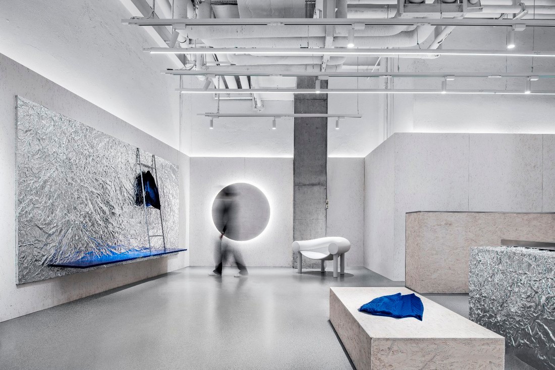 这些材料加强了人们对于品牌核心面料的感受,成为品牌印象的一部分。锡纸的肌理与质感回应了服装面料的工艺与光泽感,墙面的艺术品以揉皱的锡纸结合品牌色制成,与展示的产品产生联系与呼应。