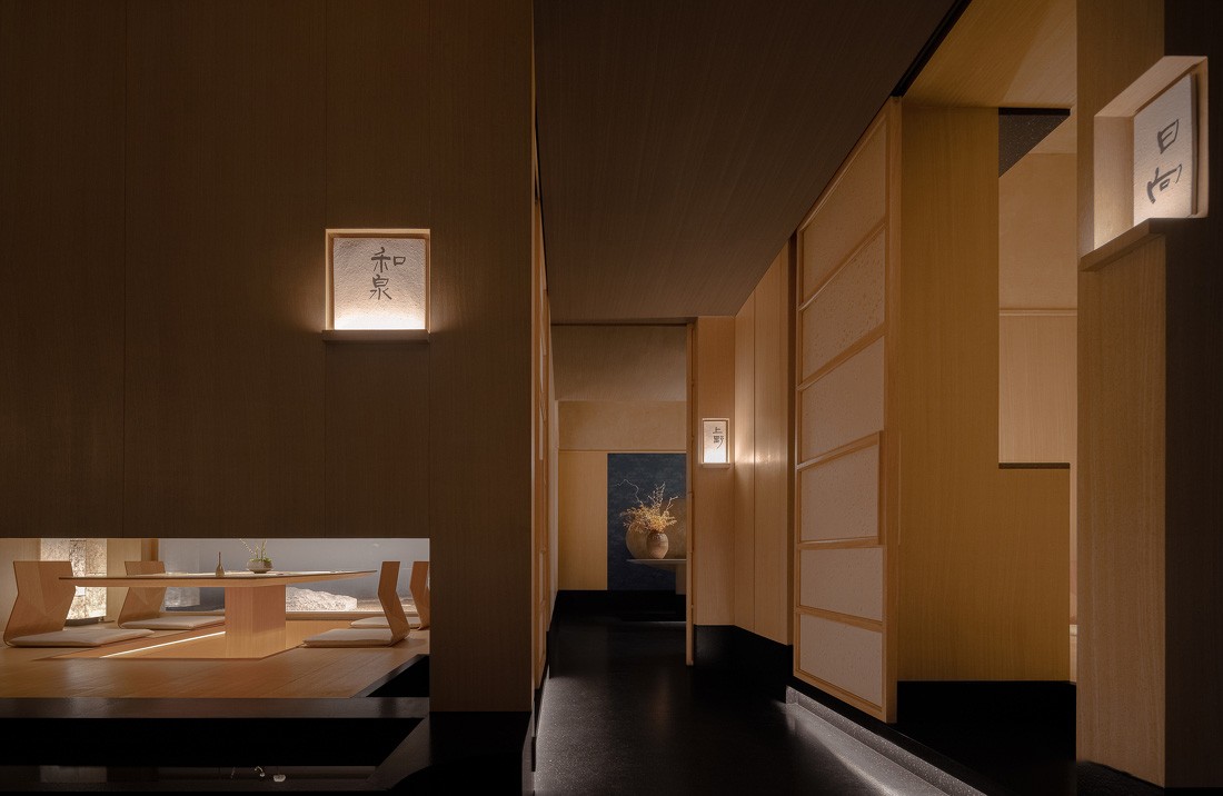 各个包间随动线错落分布,极具自然纹理感的障子纸构成半透明的隔离,创造了含蓄的感情分割,从无半分勉强与刻意营造。