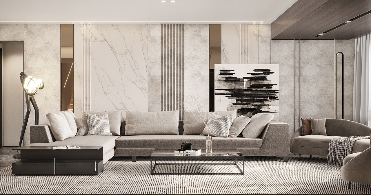 轻纱曼妙过滤了日光,墙板转角包围,错落出精致的白色石材。