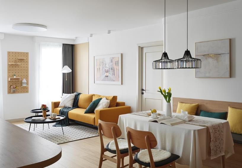 餐厅缺失的收纳、展示部分,由暗藏储物空间的卡座与墙面的开放格置物架共同完成。 尺寸恰到好处的长条餐桌,搭配樱桃木餐椅、北欧风情的水晶吊灯,餐厅热闹而不拥挤,满载生活的温馨与小确幸。