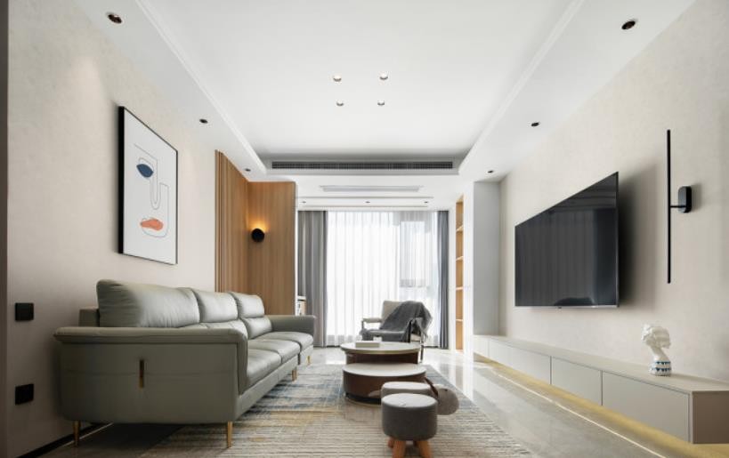 电视背景做了满墙深度350mm的收纳柜,结合悬空抽屉柜,延续极简造型设计,让收纳于无形,给收纳消消肿。既可以收纳书籍,又可以做旅行纪念品展示区,空间整洁不凌乱。采用中央空调系统,舒适度会更好。