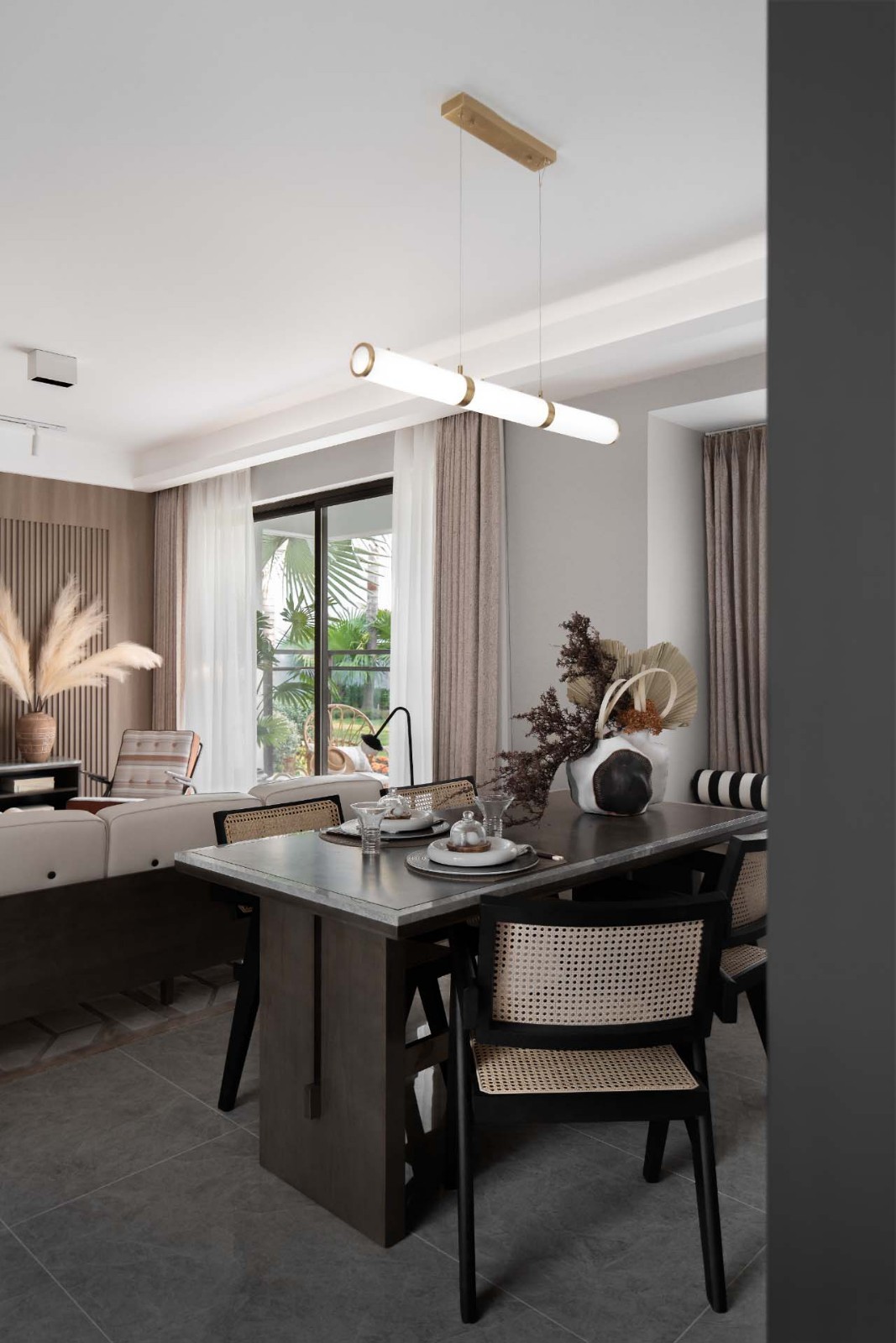 映入眼帘的是温润的木饰面以及略微粗糙的布料,无不体现着家的温馨,在这里,饮茶闲聊,悠扬的音乐和海水带来的咸甜,将脚掌包裹在布艺中,仿佛宠物伏在脚边摩