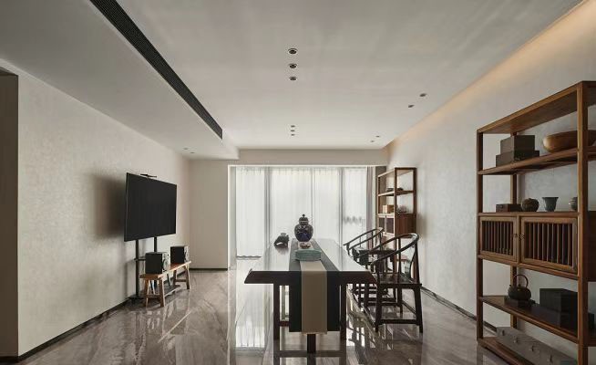 使用可自由移动的电视机,可切换不同的生活场景;使用形态简洁清秀的酸枝木家具,同时又打破了传统的客厅布局,以茶桌代替沙发;