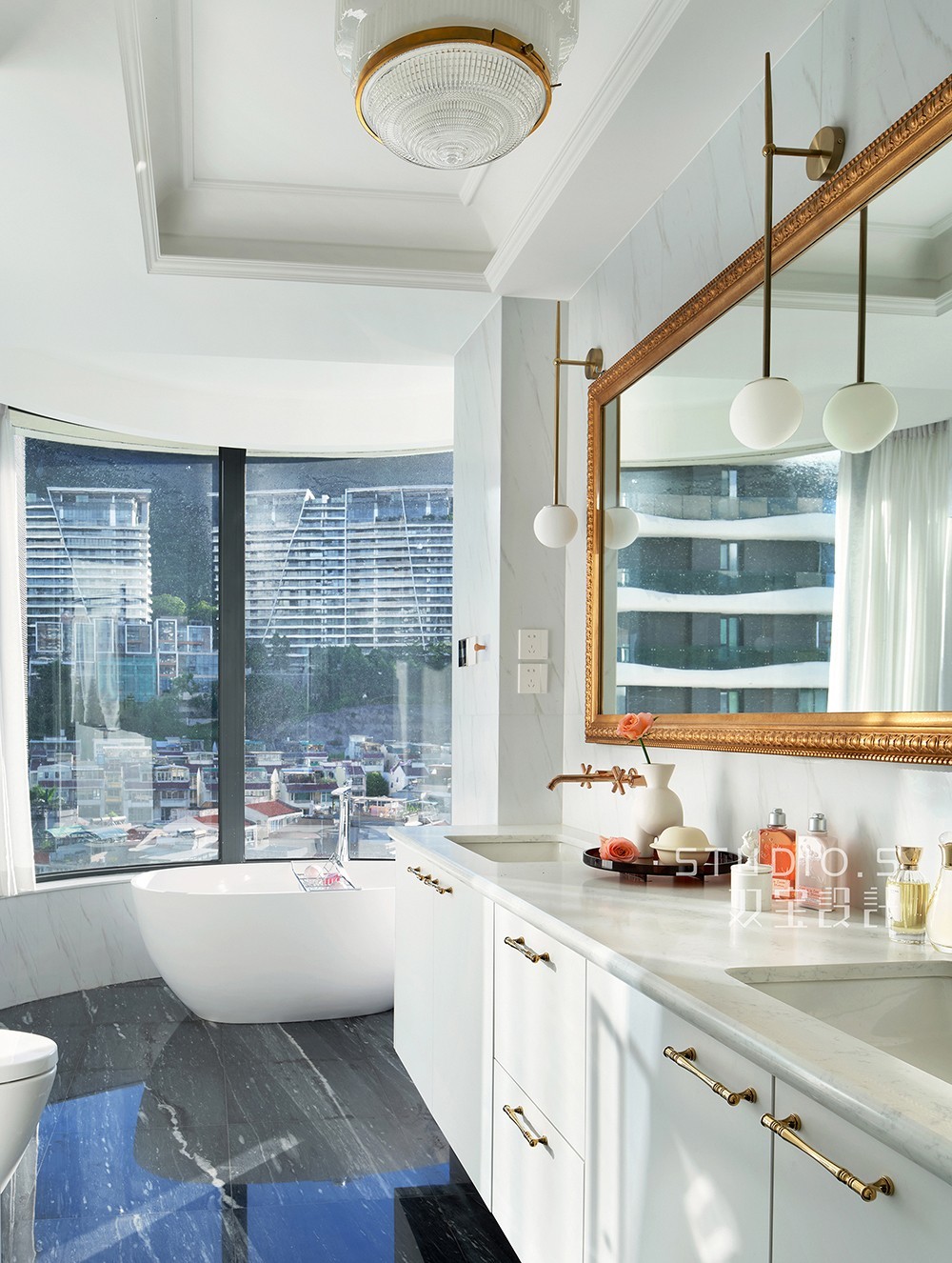 浴缸被安放在一面180°的大玻璃窗前,利用“偷”来的面积为卫生间增加了更多使用空间,可以在傍晚舒服的躺在里面泡澡,欣赏窗外180°的城市夜景,并且做了干湿分离,淋浴间用玻璃门做隔断,不会影响光线的进出,干湿分离阻隔了水汽的流通,保持淋浴区以外的空间干燥
