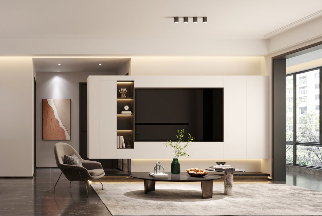 简约的大白墙利用顶部的灯带与射灯进行空间氛围的营造,一组多人位的沙发搭配着一组岩板的茶几,一株清新的绿植,为这个空间提供了多样的层次感。