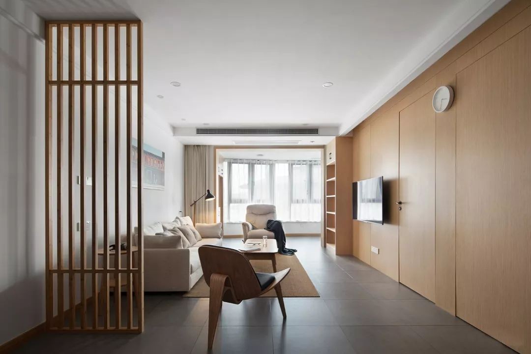 ▲ 客厅空间通透感极强,中度灰的地面与原木色家具的搭配,让空间舒适而清新。