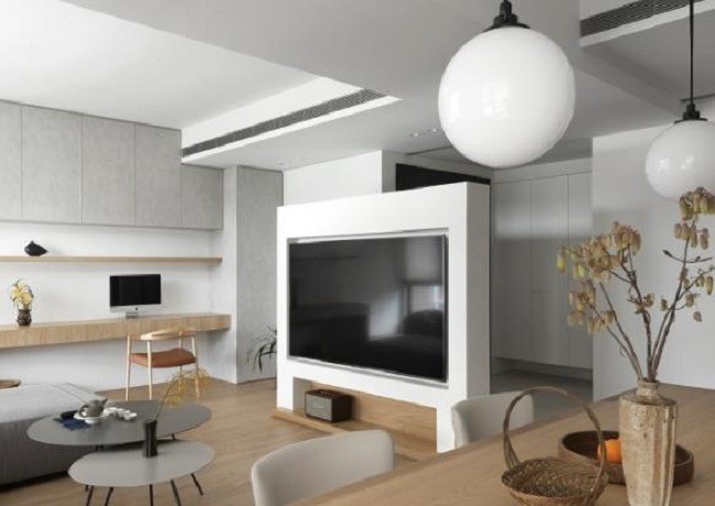 将电视屏镶嵌在白色的单个墙体里,使整个房间更具艺术感,并且让其空间性更强。