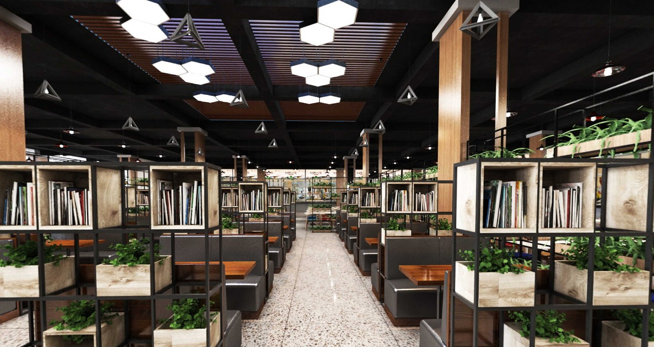 客户的要求是不断优化学生食堂,让学生更快捷的用餐、学习,所以在食堂里也设计了一些书架供学生们进行阅读,同时设置更多的用餐窗口,防止用餐时间拥挤