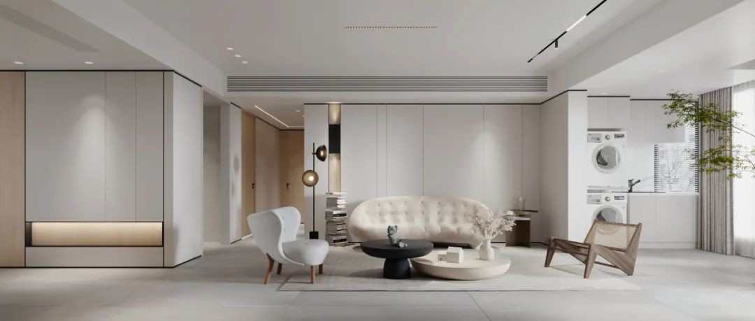 客厅采用无主灯照明,见光不见灯的设计是对于人***的顾及;米白色为主,是干净纯粹的色调;没有过多的装饰,只是将木色和黑色穿插在空间中。 闲暇之时,靠在软体沙发上;随意团坐,只是放空发呆,也是一种浮生偷闲的舒畅;一边是宽敞包容的客厅,一边是通透明亮的餐厅,既自由开放又互相关联。