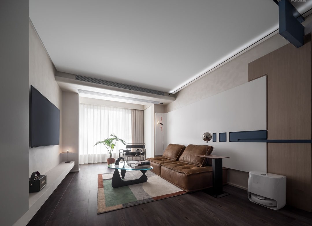 电视背景墙毫无它饰,一组悬空的柜体绵延至客厅与阳台隔墙,局部的立柜与隔墙在视觉上形成对称的效果,增加空间的端庄气质。