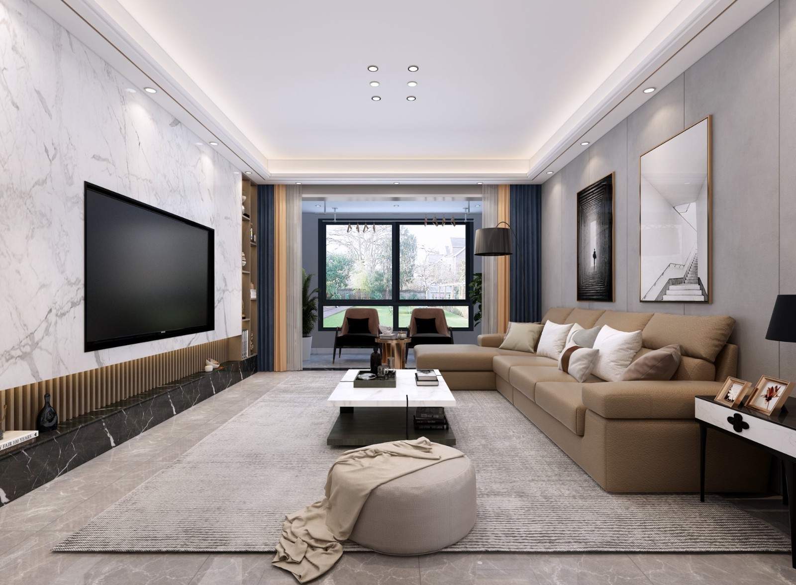 石材的电视背景墙搭配着底部的格栅板与地台式设计,在顶部灯光的照射下,层次感丰富。客厅做的无主灯设计,利用顶部的灯带,射灯与角落旁的落地灯,为室内空间营造出明亮舒适的氛围感。