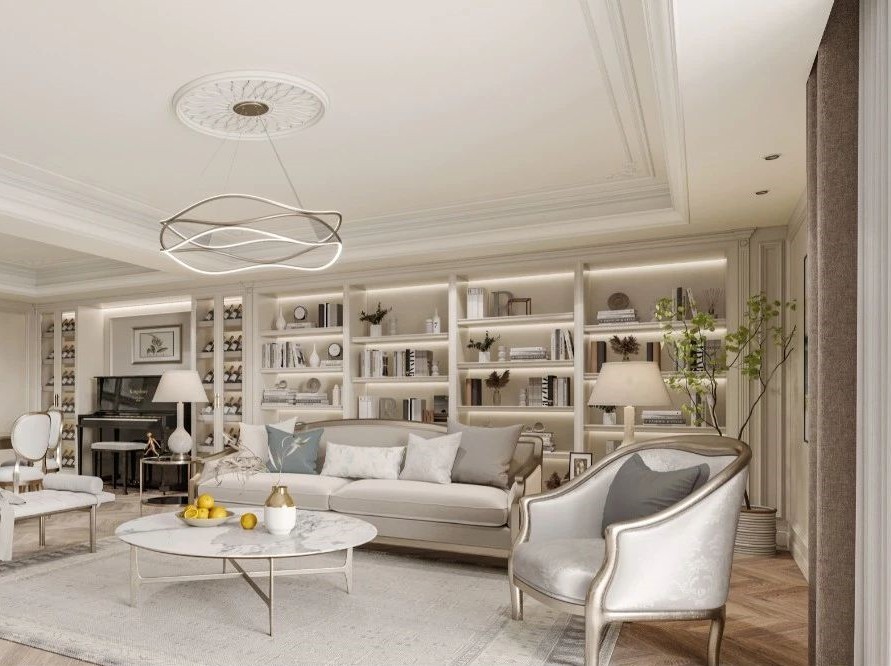 渲染大面积空间从房顶落下的白色,与浅色地板碰撞相遇,银白与淡金的过渡蔓延填充中间地带,闪耀的金色点缀其间,铺就质纯优雅的空间。