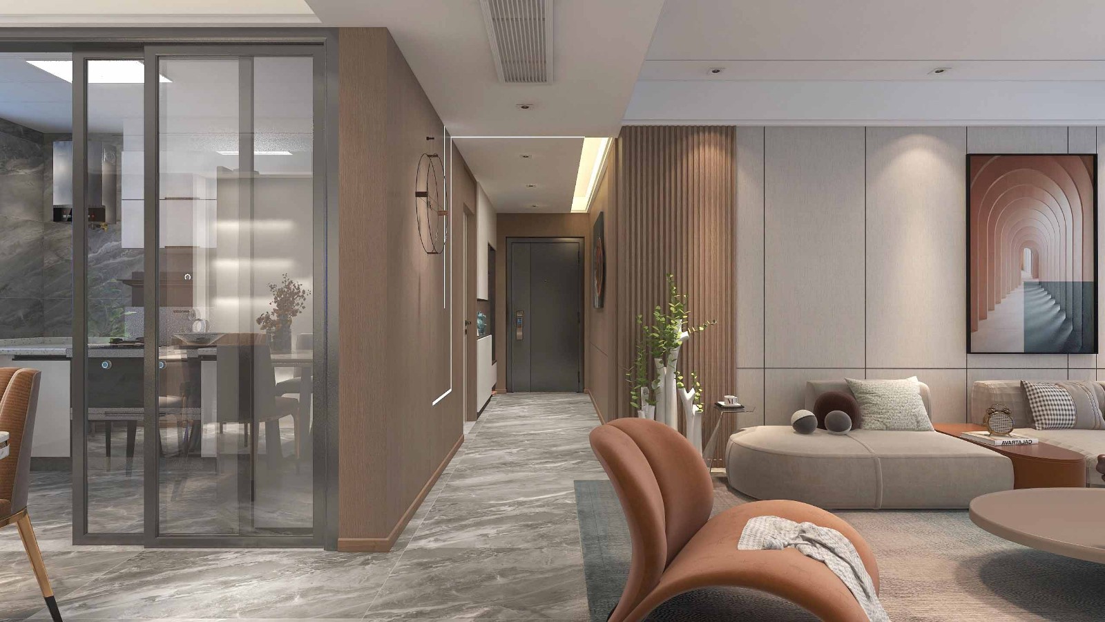 本案例为一套面积为110m²轻奢极简风,整个空间用硬朗的金属和石材搭配,与灰色地面相互映衬,再加上家具和软饰的和谐统一,使的整个空间时尚简约但又不失奢华。