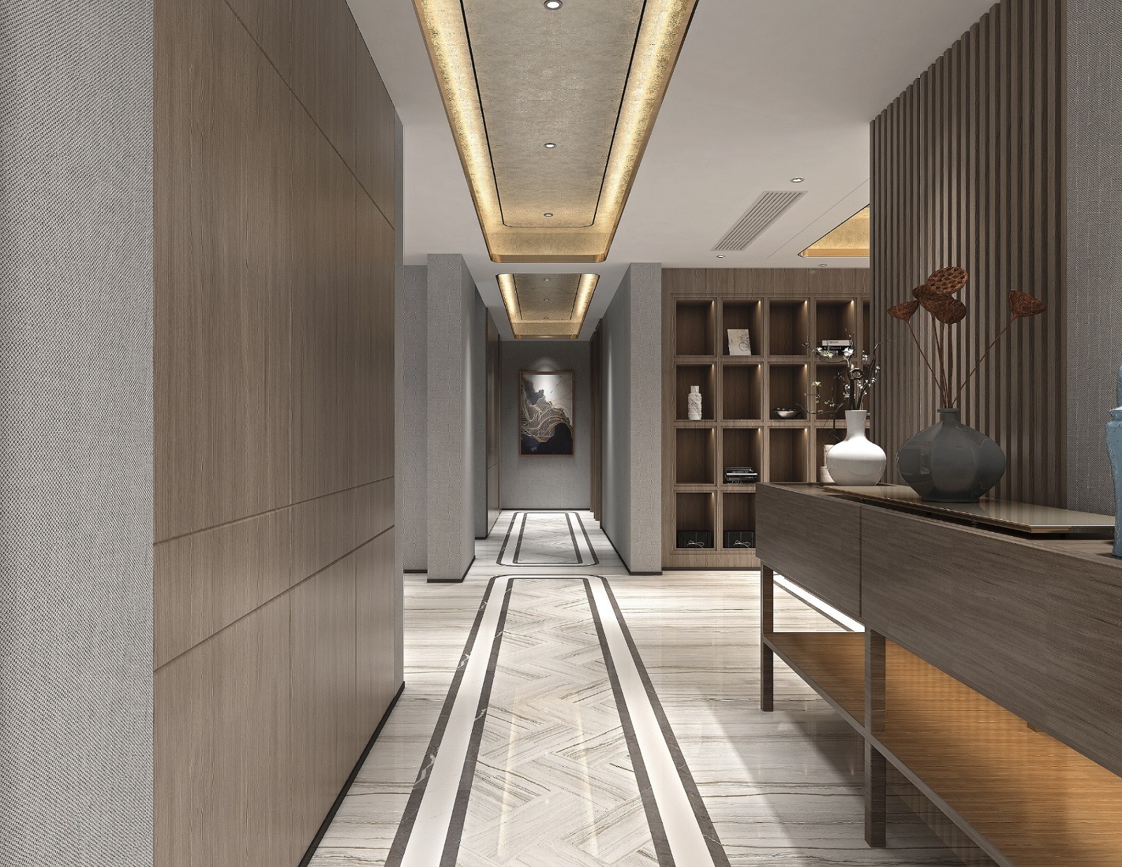 过道宽敞明亮,充满沉稳气息。