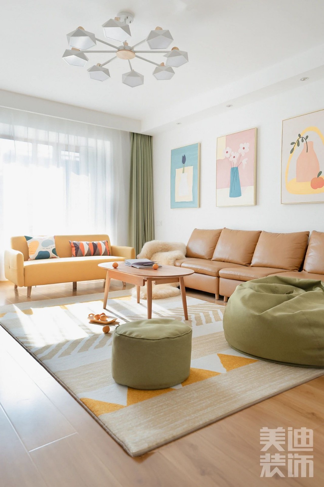 清新自然的客厅,原木搭配上亮色软装、绿植和壁画,自然又清新治愈。