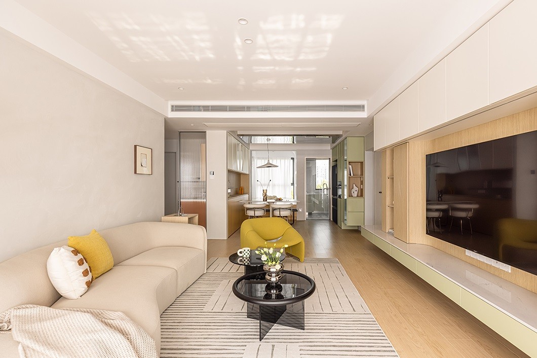 线条简洁的现代空间中大面积运用暖白与原木,搭配浅草绿,趣味黄等色系,达到温馨且有格调的居家氛围。
