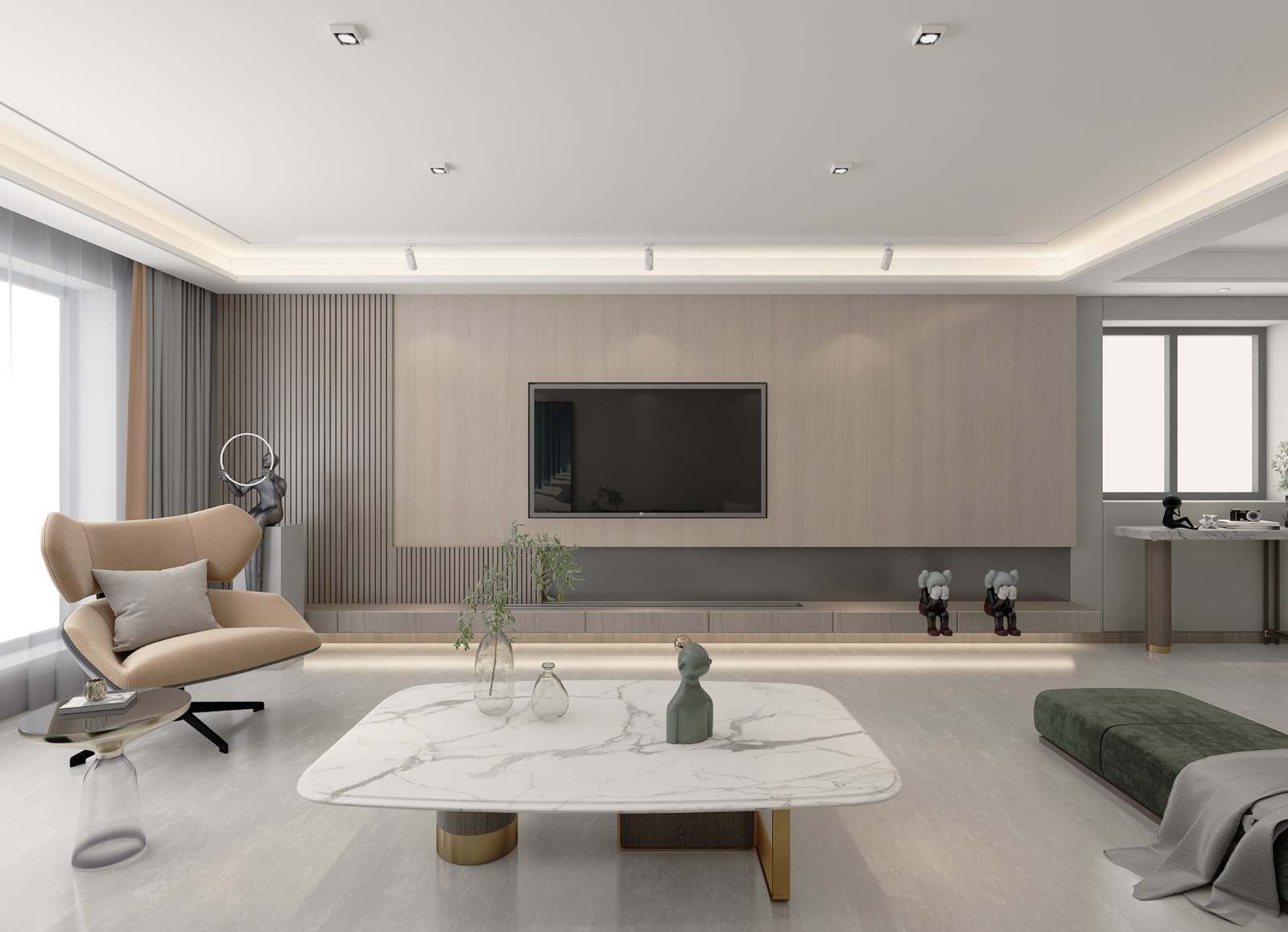 客厅:电视背景墙沙发背景墙材质呼应 无主灯 磁吸轨道灯
