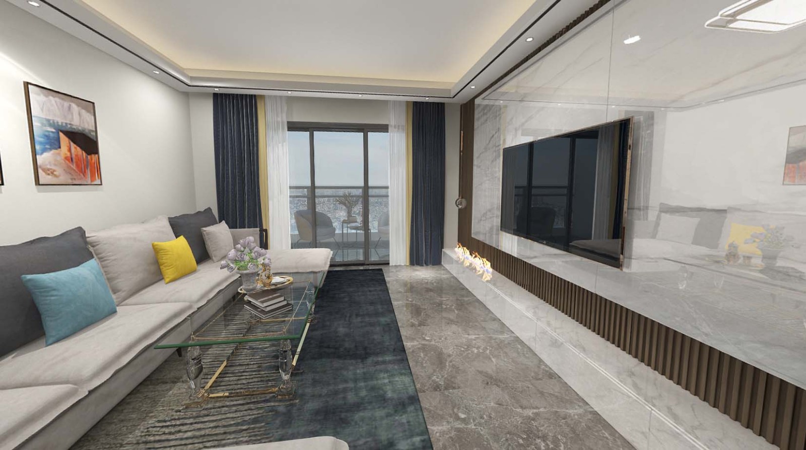 电视背景墙用的是岩板饰面,,再配以同色系的电视柜使电视背景看起来充实又不混乱。配上顶部回型灯池设计,使整体看起来协调一致,