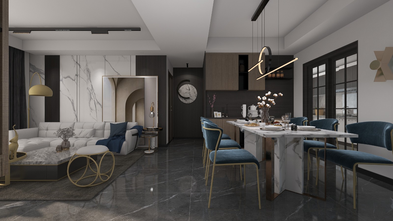 客餐厅墙面采用长城板上墙,辅以大理石纹大砖尽显空间大气之资