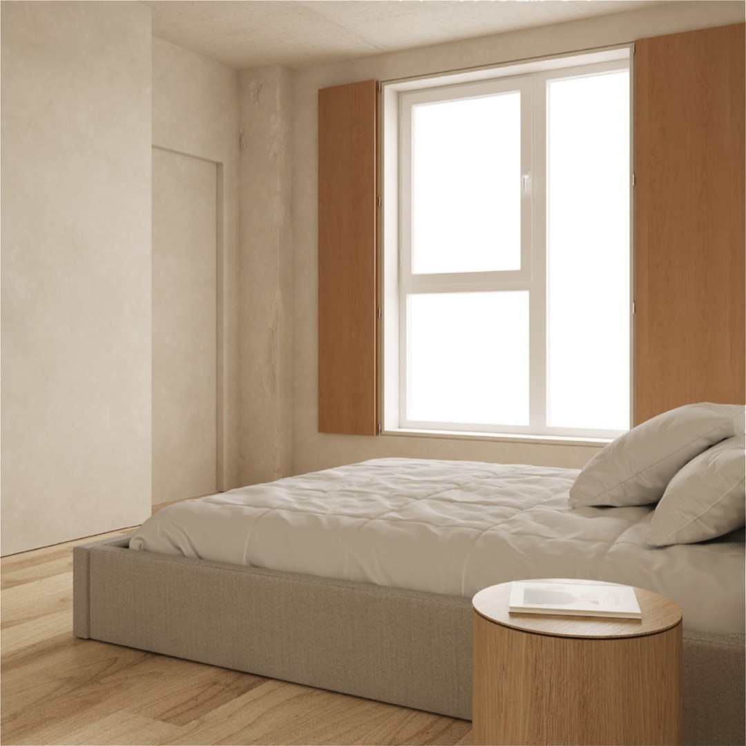 卧室铺设木地板,营造温润轻松的氛围,木饰面板代替窗帘,遮光效果更好。板墙代替床头,整体性好,壁龛放置床头灯,把简洁氛围拉满。 床头另一侧用了圆柱型床头柜和黑色落地灯,配饰的几何感同样很强