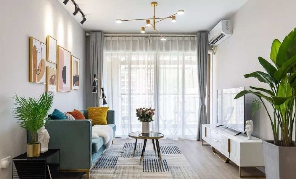 薄荷绿的三人沙发,加上色彩多样的抱枕,让客厅看起来不至于枯燥乏味。
