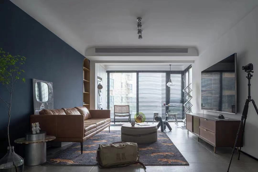 神秘深邃的蓝色作为沙发背景,配上搞怪的镜子元素和充满生气的绿植,也是意外的和谐舒适。乳胶漆选用嘉宝莉,环保,覆盖性好,不容易透底,有效减少开裂情况