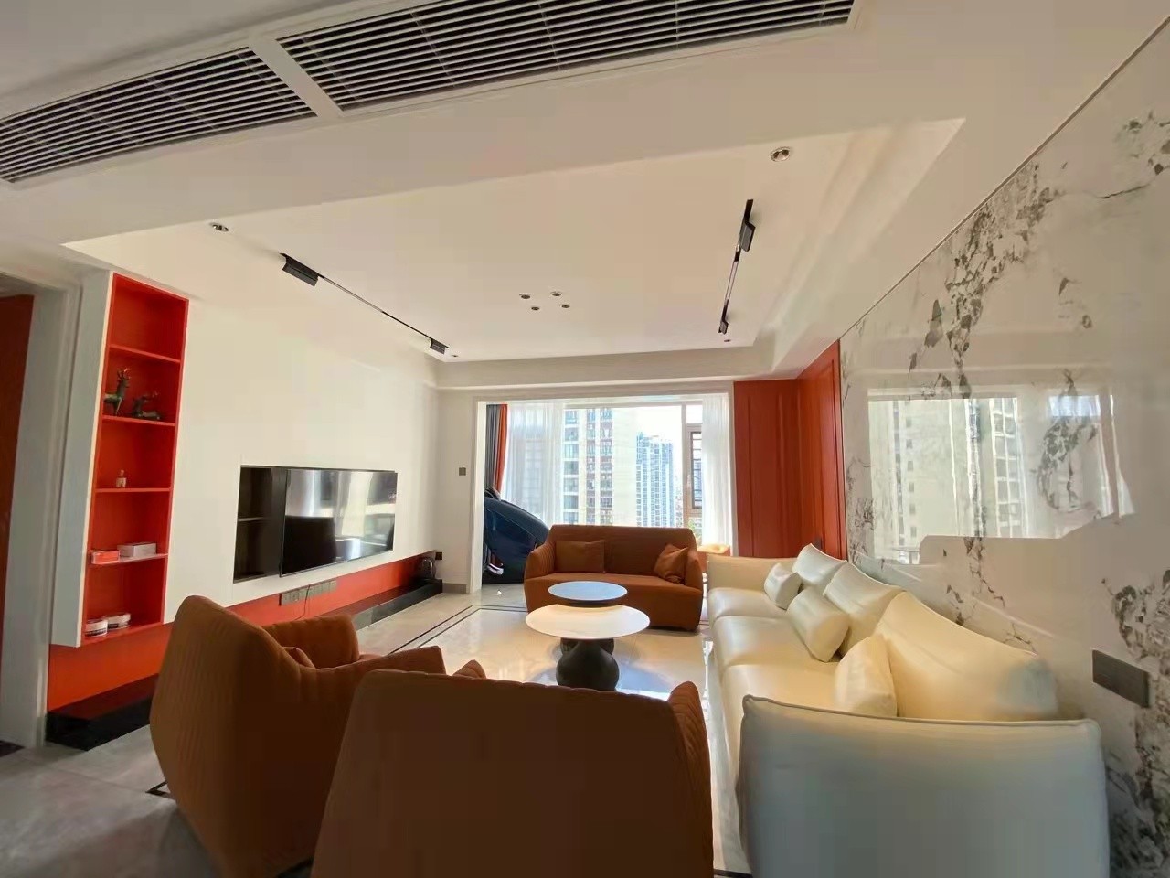 客厅采用无主灯设计,墙面刷的立邦乳胶漆,柜子使用跳色部分,客厅地砖做波导设计,卫生巾上墙600x1200的地砖铺贴,颜色是有点鱼肚白的,看着干净又大气。