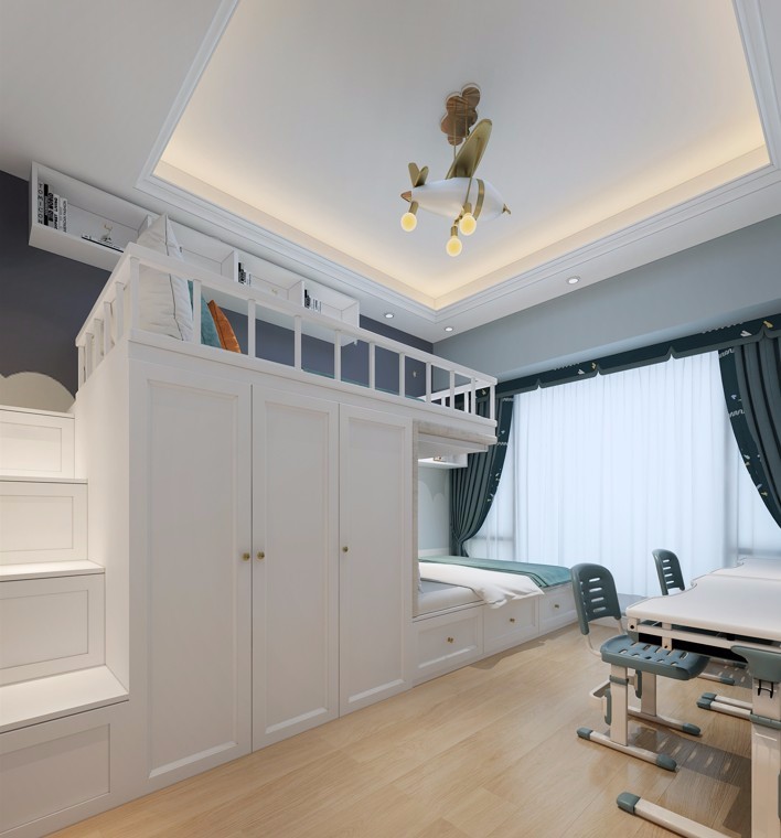 规划两兄弟同住一间房,上下铺更好的节省空间,增加储物。设计上没有选择传统的上下铺形式,而是选择错层上下铺。下铺床为榻榻米形式,底部可以储物收纳,靠外围的作为抽屉方便使用。