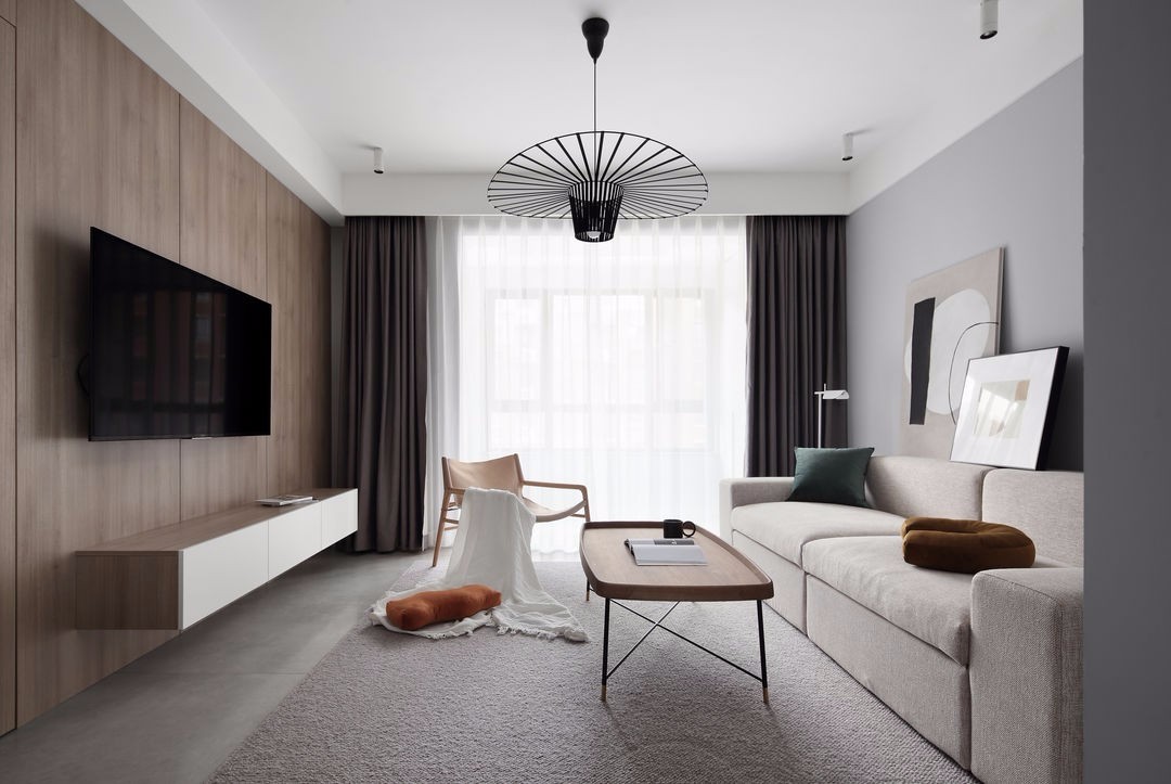 木饰面修饰电视背景墙面,与左侧“通道”形成独立的体块构成,木盒子打造另一空间的视觉偏差