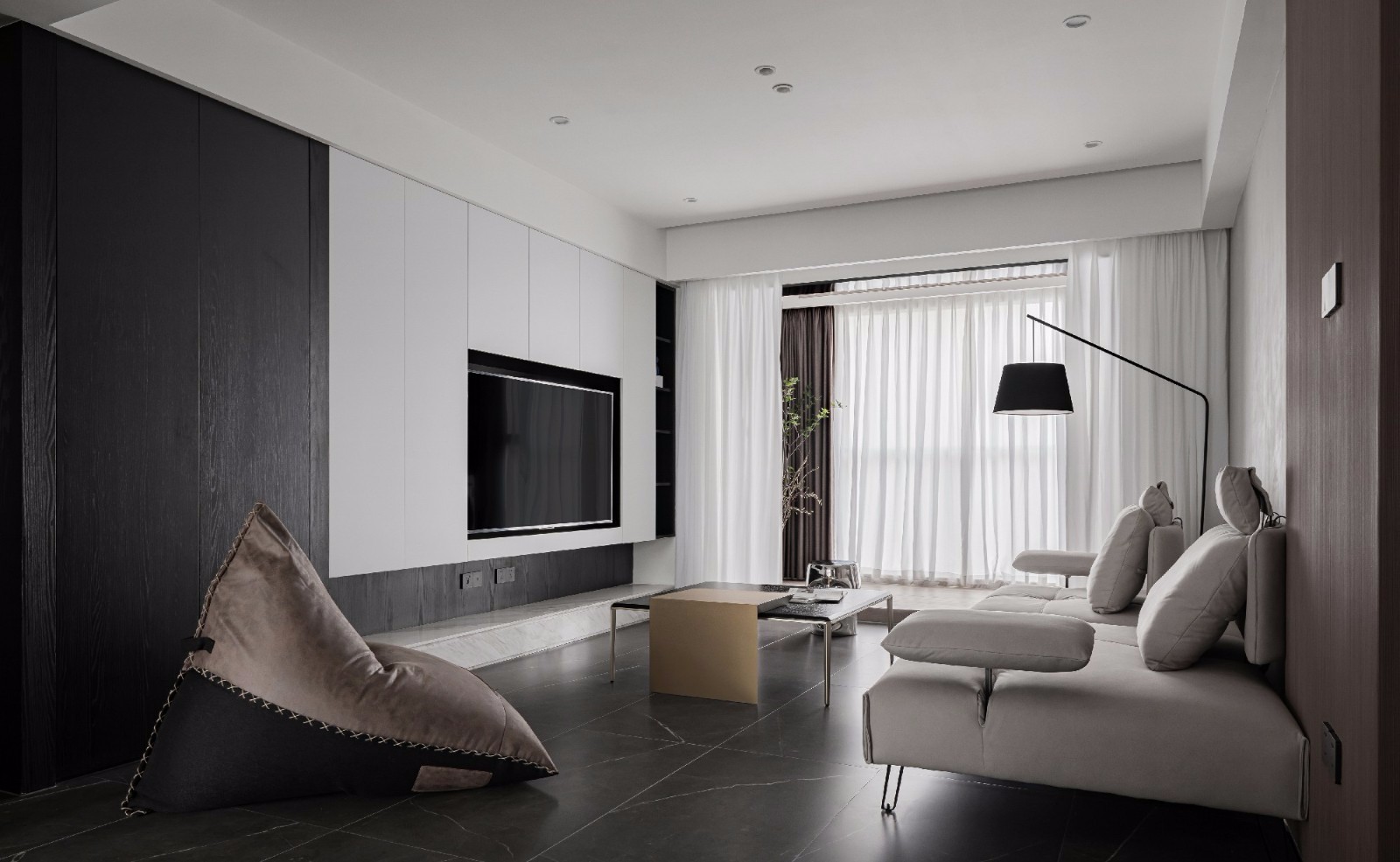 黑,白,灰,咖, 是我们整个客厅的材质用色, 比较内敛,沉静。