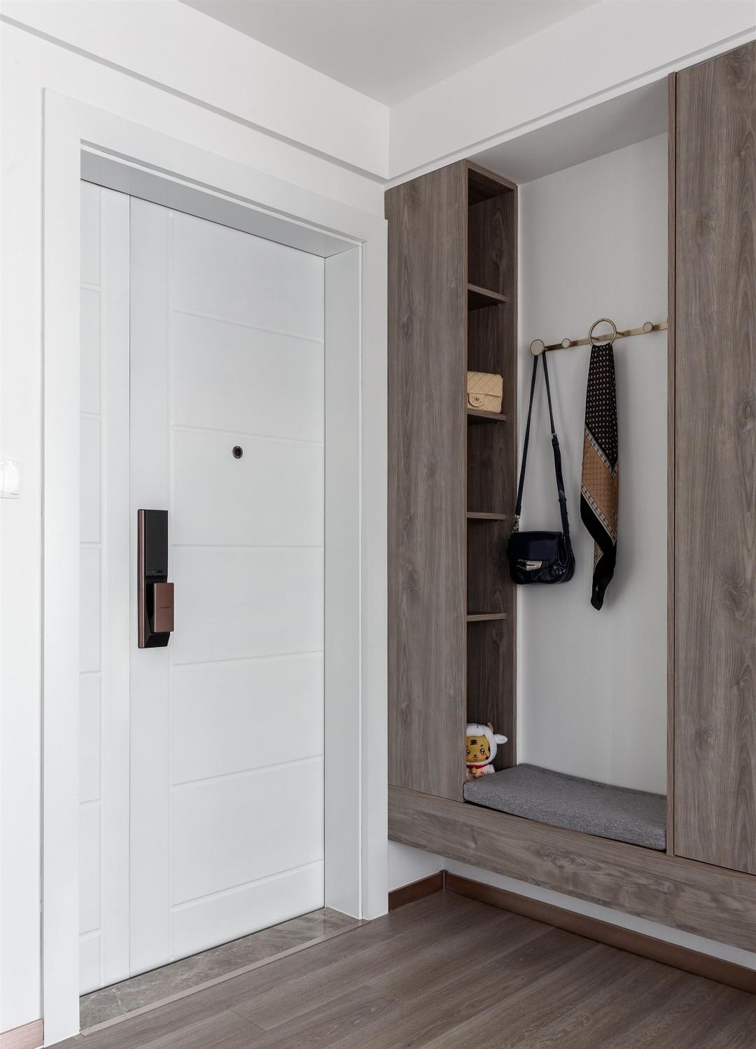 开放式橱柜的设计十分用心,大小不一的间距让女主人能够放置不同尺寸的包包。玄关柜底部留空,可以放置拖鞋。利用整体橱柜的空隙打造卡座,放置坐垫,提供舒适换鞋空间。