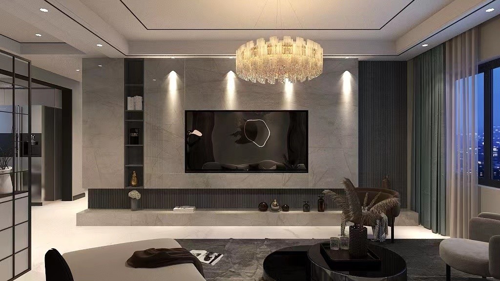 客厅电视背景墙主要以岩板和木格栅为主的一个流行趋势
