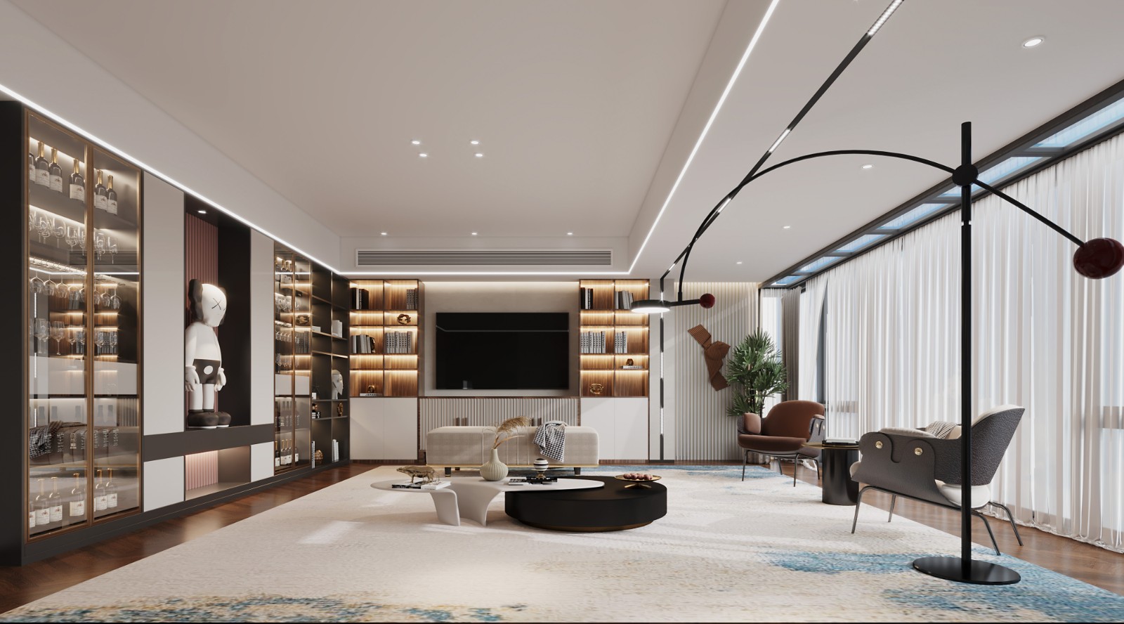 黑白色相结合的茶几造型独特。 一方洁白的地毯带着浅蓝,走上去犹如漫步云端,时间也在这里驻足停留,静享这美好的一刻。