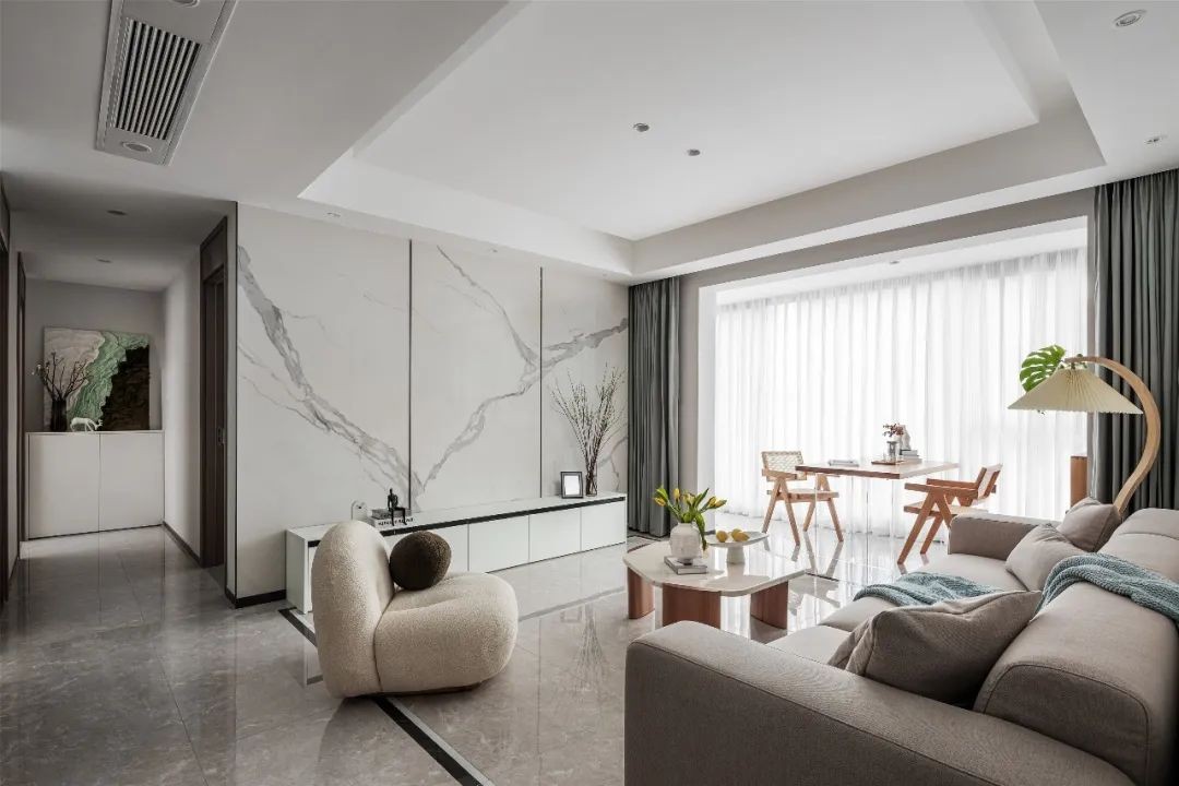 客厅摒弃了繁杂的装饰,简约的灰色布艺沙发搭配石材与木质组合的茶几,各类温和的材料毫无违和感,在空间中散发着自然的气息。S形落地灯牵引着视觉重心,为空间增添了柔美的艺术氛围。