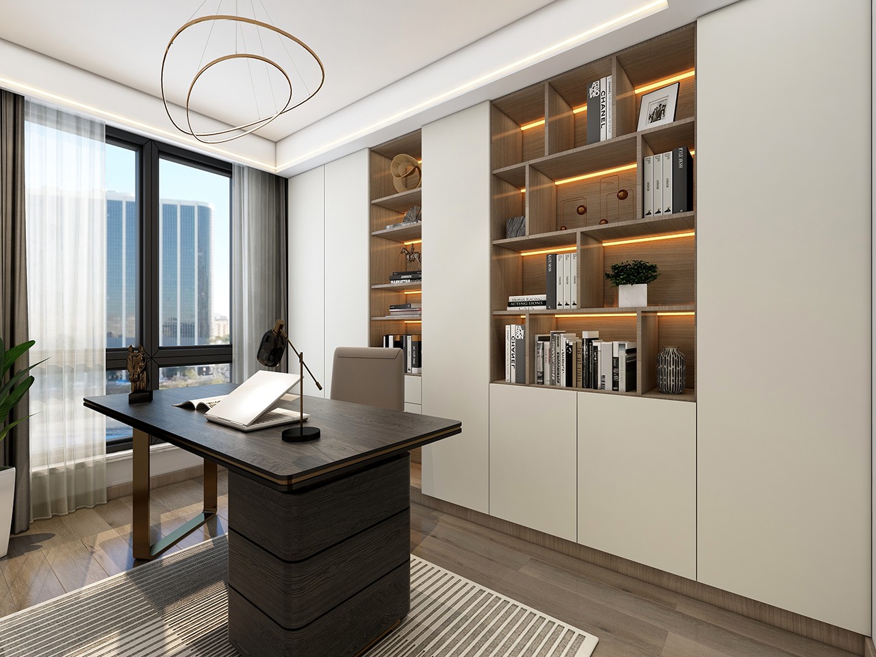 本案风格为现代极简风格,户型为坐北朝南,三室两厅,一厨两卫。窗户透光大,通风效果***。客户要求:客厅通透性强,风格简单。但不失***。