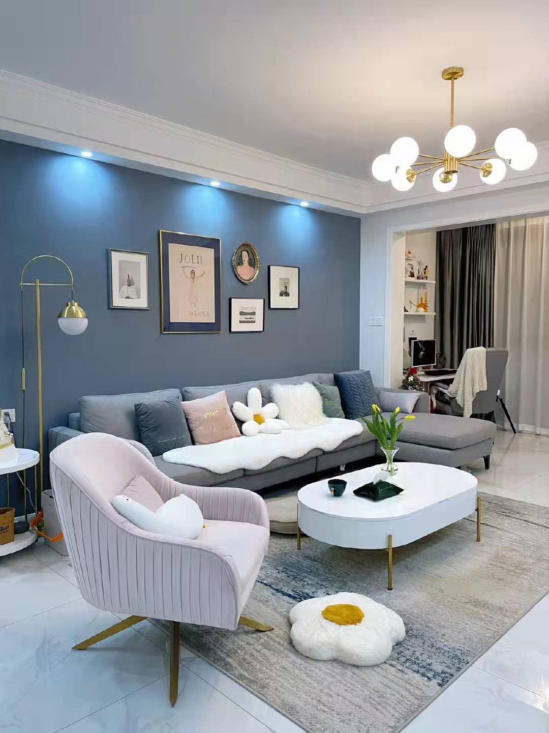 客厅实现女主人愿望采用大面积蓝色做为沙发背景,给人眼前一亮简约质朴带着独特的格调