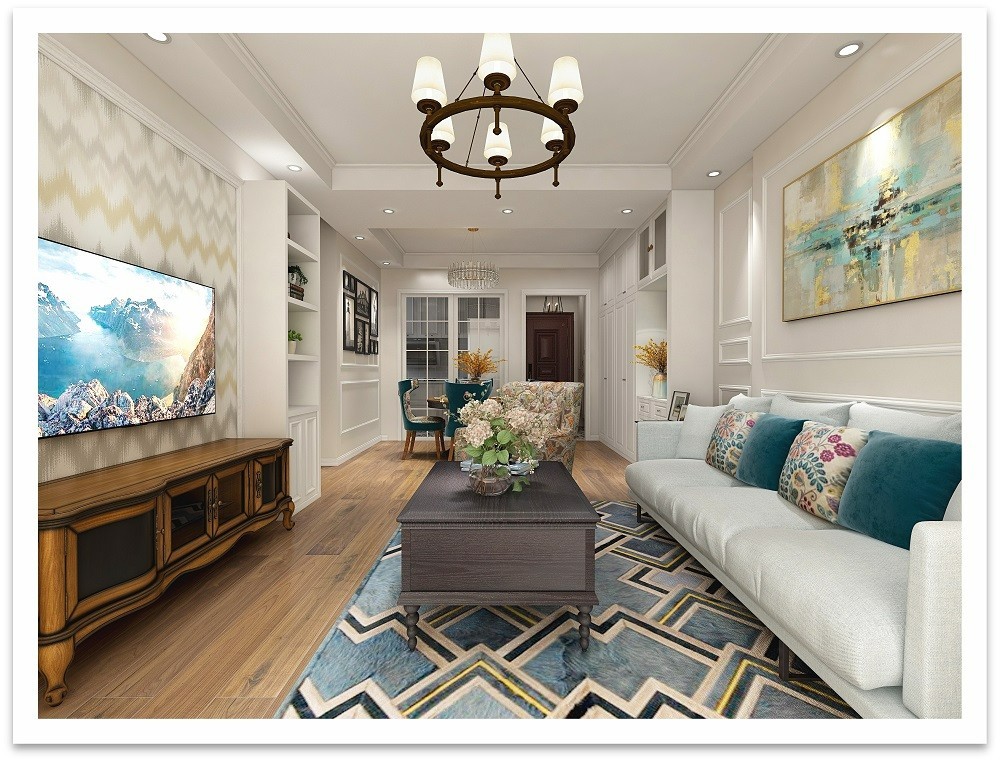 客厅:客厅运用米色、月白、灰色、蓝色等多种颜色搭配,营造出温馨、舒适、雅致之感。主沙发选择了手感细腻、坐感舒适的材质,侧边摆放单人布艺沙发。色调主次分明,整体协调、温暖,围合式布局的摆放形式更是让室内充盈着温馨、舒适的居家