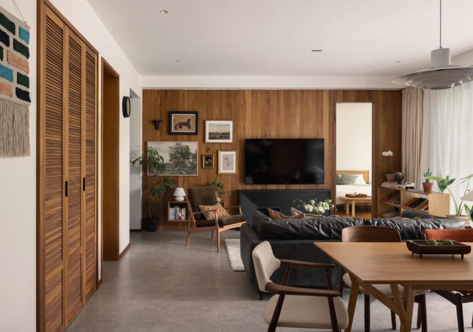 进门***视角,大量木饰面以及复古元素的运用,一进门就为空间奠定了混搭的基调,并且在白墙的衬托下,将木饰面固有的温润与清新,给展现的淋漓尽致。而当主卧门洞改到右边后,原位置则装饰了照片及绿植,***化地美化了进门后的视觉感。
