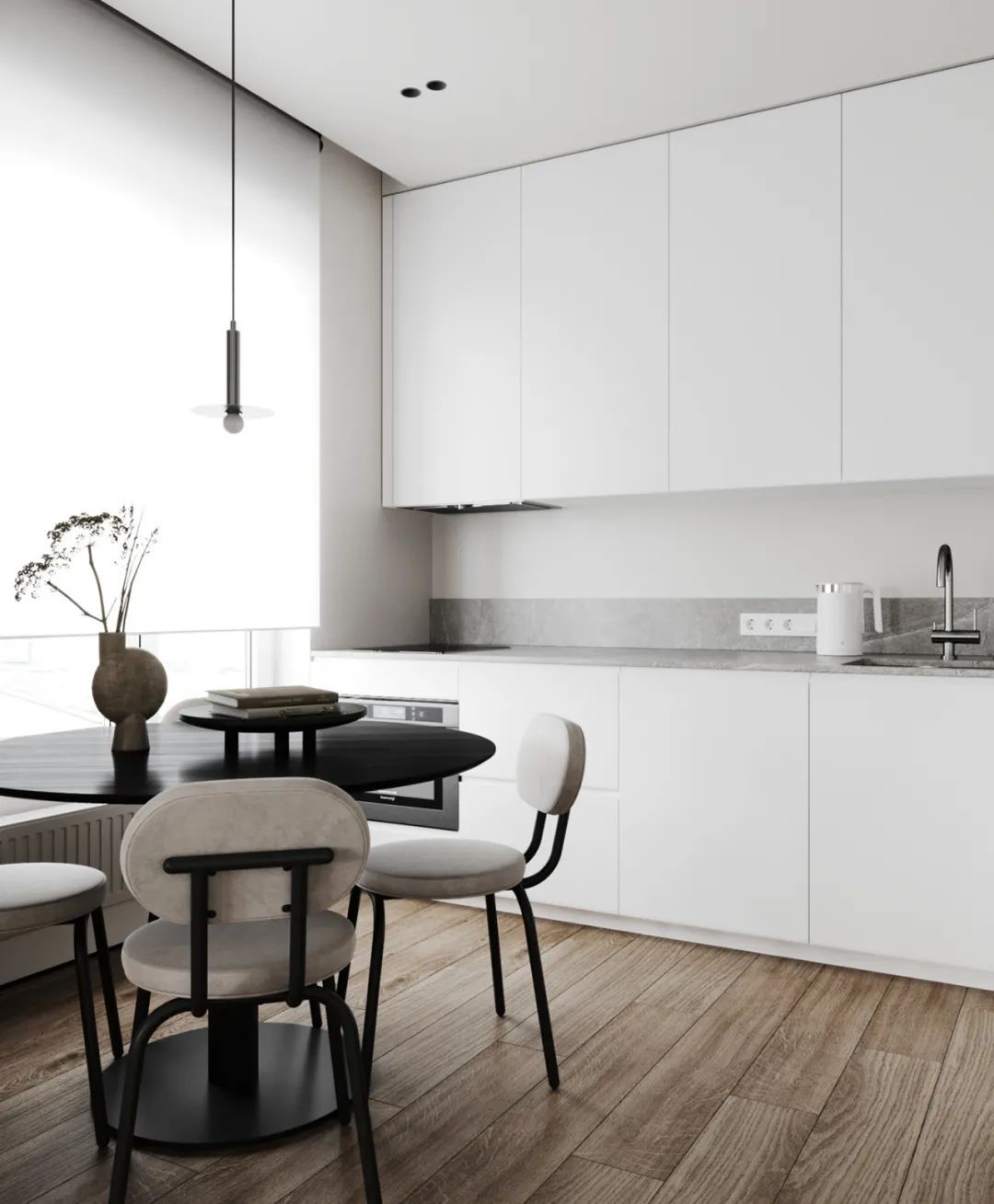 开放式厨房选用白色橱柜门 结合灰色的水磨石台面与挡板 提升生活的便利性,视觉上也更显统一