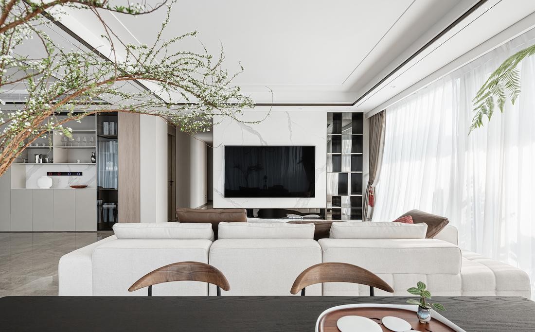 客厅以低饱和度的色调贯穿整个空间,舒缓柔雅,布艺米白色沙发搭配浅色的地毯,展现出和谐统一的空间质感。红色与木色点缀在其间,舒适温馨而不失格调。