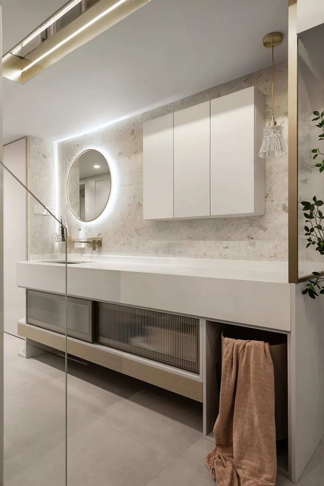 卫生间的洗手台,移到了鞋柜的旁边,台面空间非常宽敞,同时也兼顾了梳妆台的功能。台面下方,设置了储物柜,柜门选择了长虹玻璃材质的,简约又通透;墙面上也增设了一个薄款壁柜,轻松收纳女主的化妆品和护肤品。