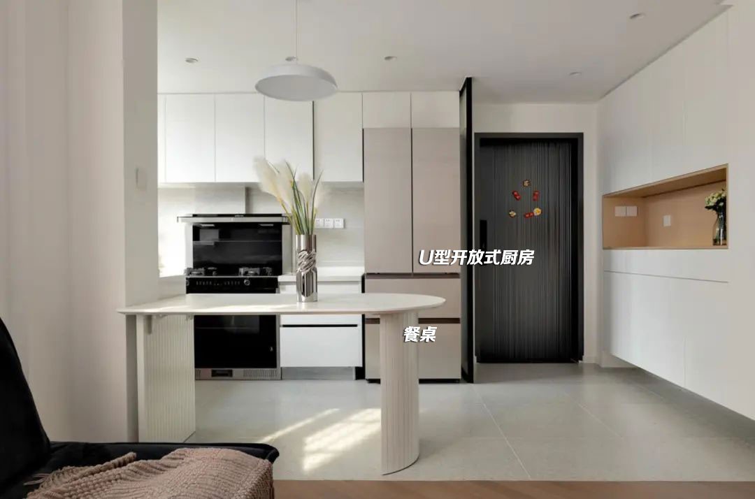 原厨房和原餐厅的面积都很小,采光和通风性也比较差。 为了解决这个缺陷,设计师拆除厨房两侧非承重墙体,做了开放式U型厨房布局,餐桌摆放在厨房和客厅之间,更节省使用空间。