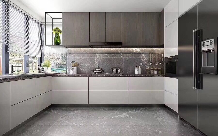 厨房地砖通铺,柜子用烤漆面板。